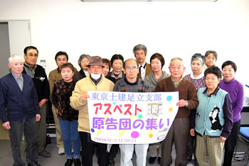 建設現場でアスベスト被害をうけた現場労働者172人が国と建材メーカーをあいてどり東京地裁に提訴しました。この原告団のなかに足立支部の仲間が15人がおり約1割を占めています。この15人のなかで7人は無念にも遺族の方々です。