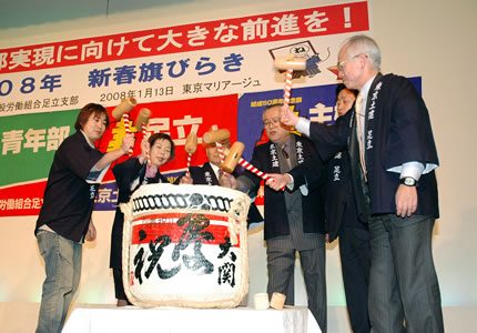 東京土建足立支部は1月13日 足立区内にて2008年新春のつどい(新年旗開き)を開催しました。主催者あいさつで野澤國男委員長は建設国保補助金の満額確保は自由民主党、民主党、公明党、日本共産党の尽力にあったことを紹介するとともに敬意を表しました。また足立支部は早期の10.000人支部をつくり要求実現に奮闘することを決意しました。
