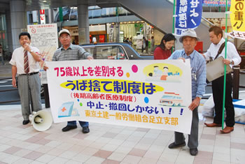 6月10日(火)の夕方6時より足立区内の北千住・西新井・綾瀬の3駅にて、「後期高齢者医療制度の中止・撤回」と「消費税増税に反対」する駅頭宣伝を足立支部で行いました。当日の参加者は3駅合計65人が集まり、参加した組合員の間でも「こんなとんでもない医療制度はやめさせなければいけない。」との声が多く、署名行動にも熱がはいりました。