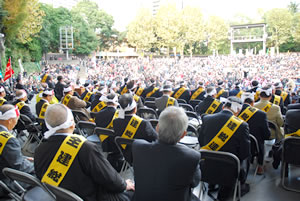 | 【写真右】日比谷野外音楽堂に全国から集まった仲間たち【写真中央】午前東京都庁内にて東京都連の予算要求に参加した足立支部のみなさん【写真左】日比谷での集会を終えて銀座・東京駅へ向けてデモ行進を行いました |