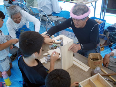 開催日当日、どこの会場でも地元住民の方たちが集まり、包丁研ぎや子どもたちの木工教室、ヤキソバ、カキ氷などの模擬店などで楽しい一日を過ごしました。