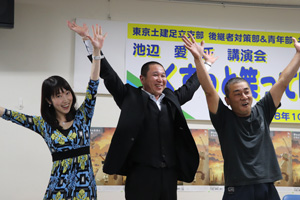 参加した組合員さんが池辺さんからの質問に答えたり、壇上で明るく楽しいポーズをとったりするなど、会場が終始笑顔に包まれる講演会となりました。