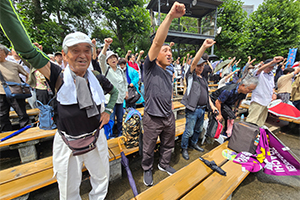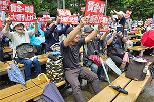 6月25日(水)東京都庁および日比谷野外音楽堂で、建設国保の補助金確保と制度の育成強化を求める「予算要求集会」が開催。雨が降りしきる中、全国から1877人が集結し、足立支部からも52人が参加ました。