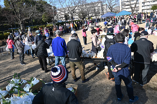 この日のため寄せられたネギやお米などの食糧と順番待ちする大行列