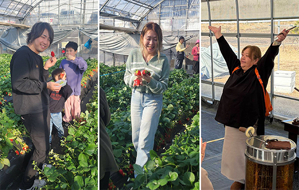 最初の目的地はハチミツ工房。試食や採取体験、はちみつかけ放題のソフトクリームを楽しみ、濃厚な味わいを堪能しました。昼食は保田漁協でかきフライに舌鼓。子ども用にはえびフライやハンバーグも付いていて「大人用より美味しそう」と、些細なことでも大盛り上がりです。さて、お待ちかねのいちご狩りはもちろん大はしゃぎ、若手は時間いっぱい食べていたためお土産が売り切れてしまいました(笑)。